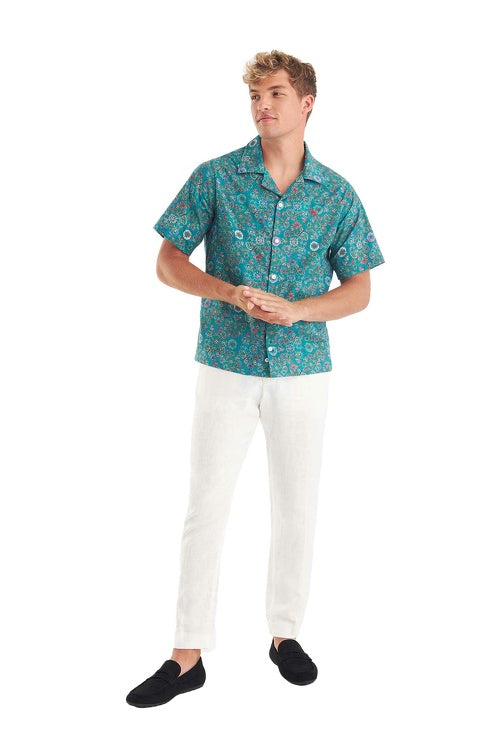 Añada color y frescura a su armario con nuestra camisa FLORAL ETHNO, hecha de 100% algodón Pima orgánico. El material ligero y agradable para la piel proporciona una sensación refrescante en los días calurosos de verano. El corte moderno y casual, junto con el vibrante estampado sobre un fondo turquesa, aporta un toque exótico a cualquier conjunto. El estilo desenfadado unisex es muy versátil para combinar.