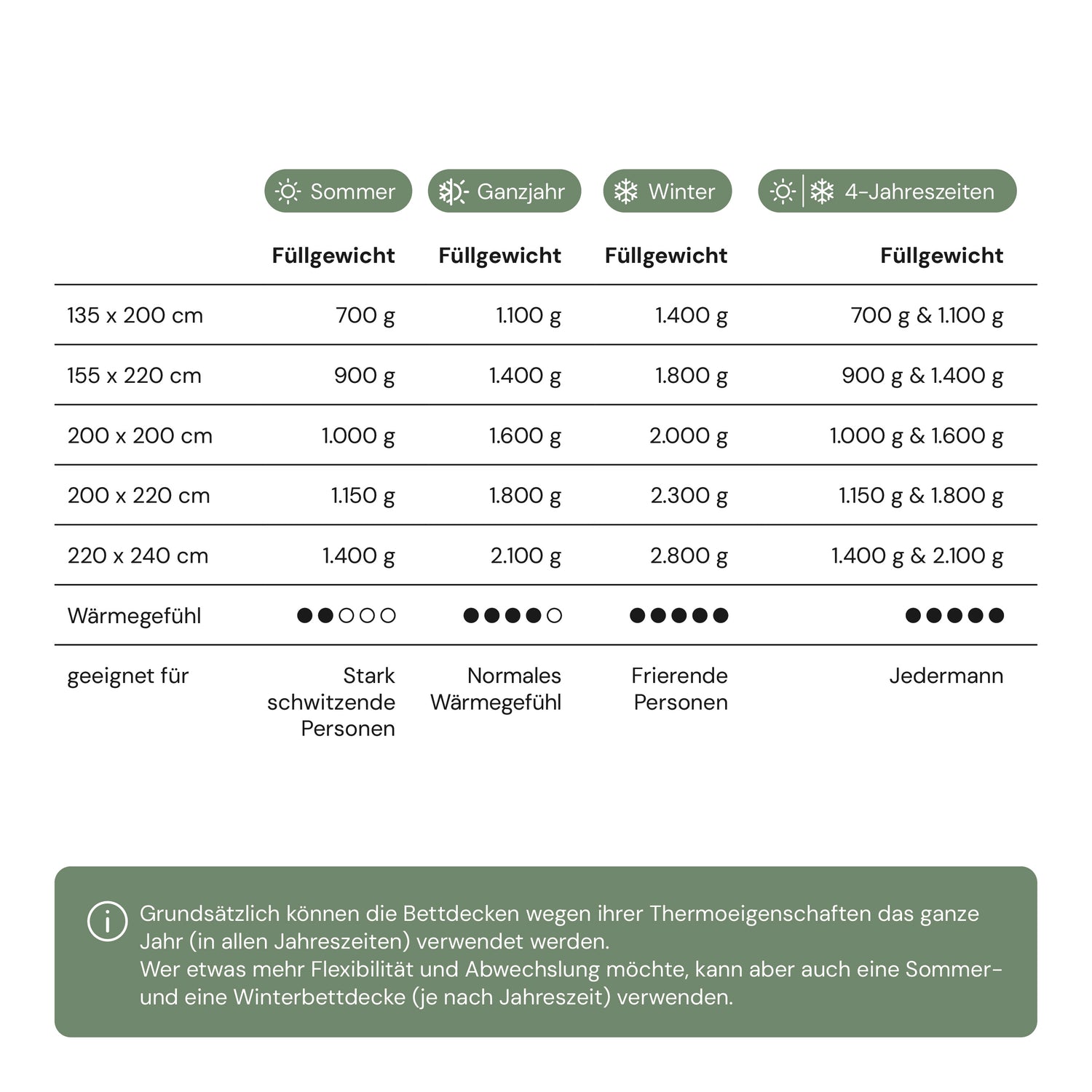 Die 4-Jahreszeiten-Bettdecke besteht aus einer Sommer- und einer Ganzjahres-Bettdecke, die bei Bedarf mit Druckknöpfen verbunden werden können und dir so das ganze Jahr über die maximale Flexibilität liefern.