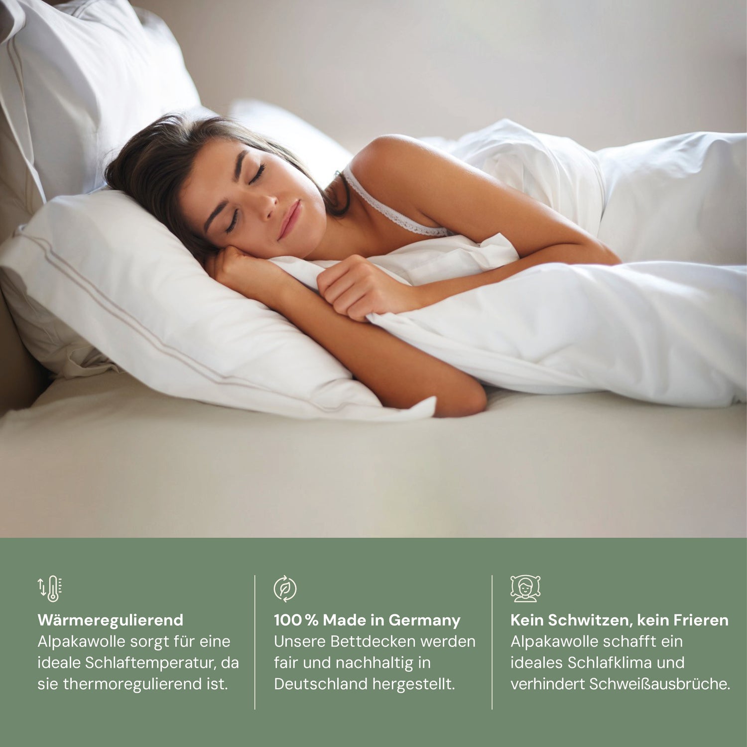 Die Naturmaterialien in Verbindung mit den einzigartigen Thermoeigenschaften der Alpaka-Wolle sorgen für ein optimales Schlafklima.