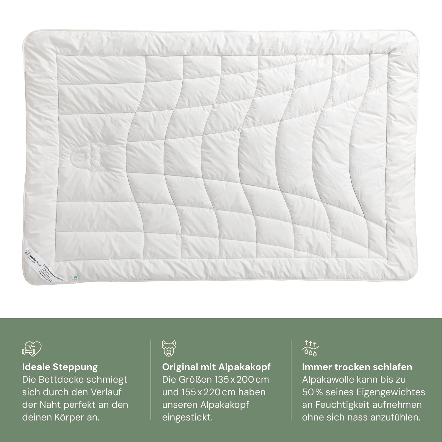 Die genialen Eigenschaften der Alpakawolle kommen in dieser Alpakadecke besonders gut zu tragen. Die Temperatur wird einfach von der Bettdecke reguliert. Hitze kann einfach durch die Decke nach außen, die angenehme Wärme bleibt in der Decke.