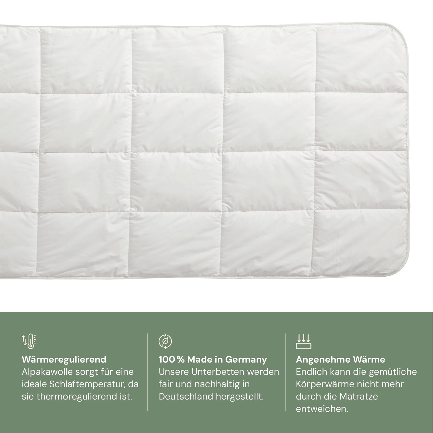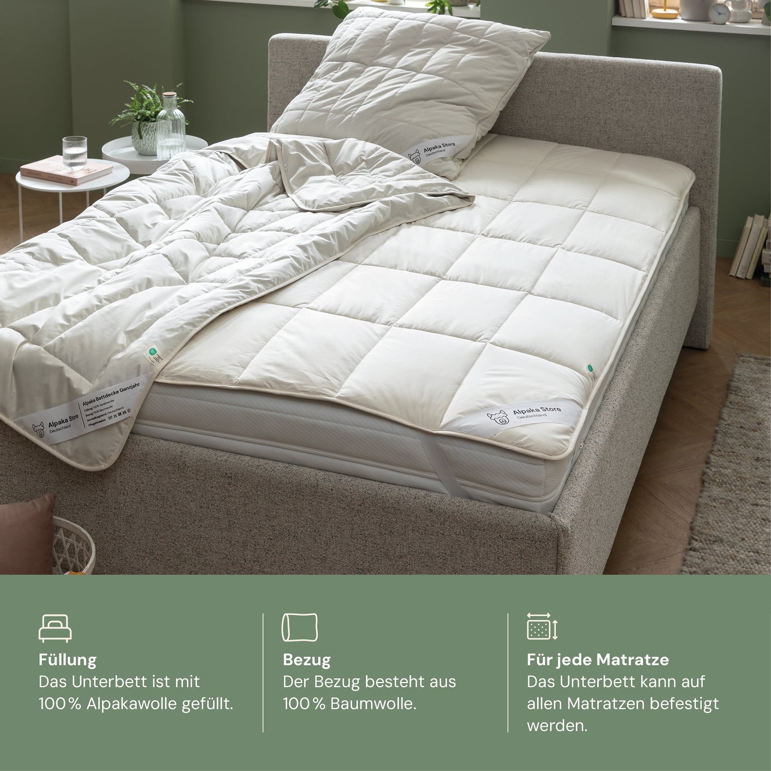 Podkład z alpaki zapewnia dobrą regulację temperatury i wilgotności, co przekłada się na przyjemny klimat snu. Podkłady są przepuszczalne dla powietrza, odporne na bakterie, samoczyszczące się i chronią materac. W zależności od pory roku ogrzewają lub chłodzą.