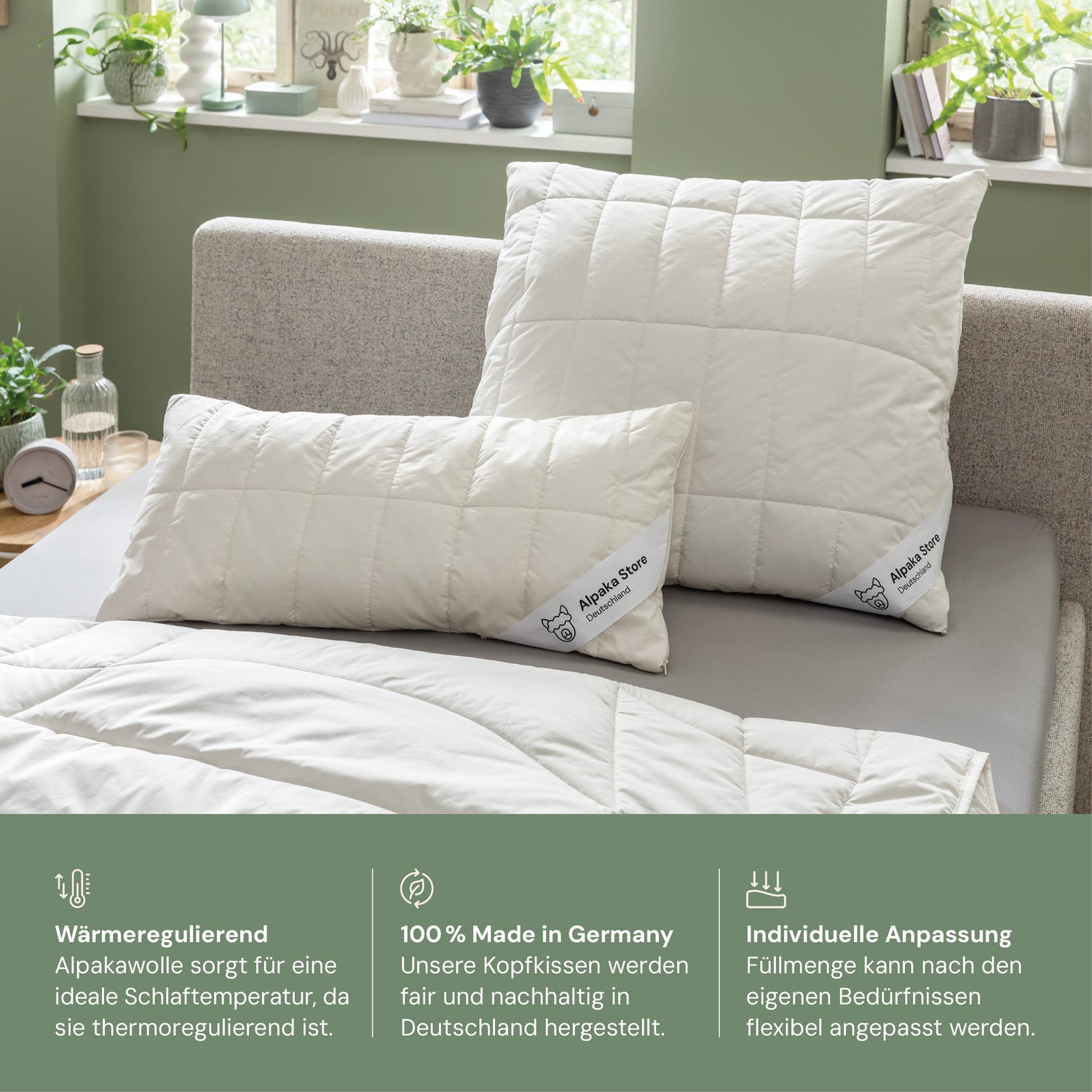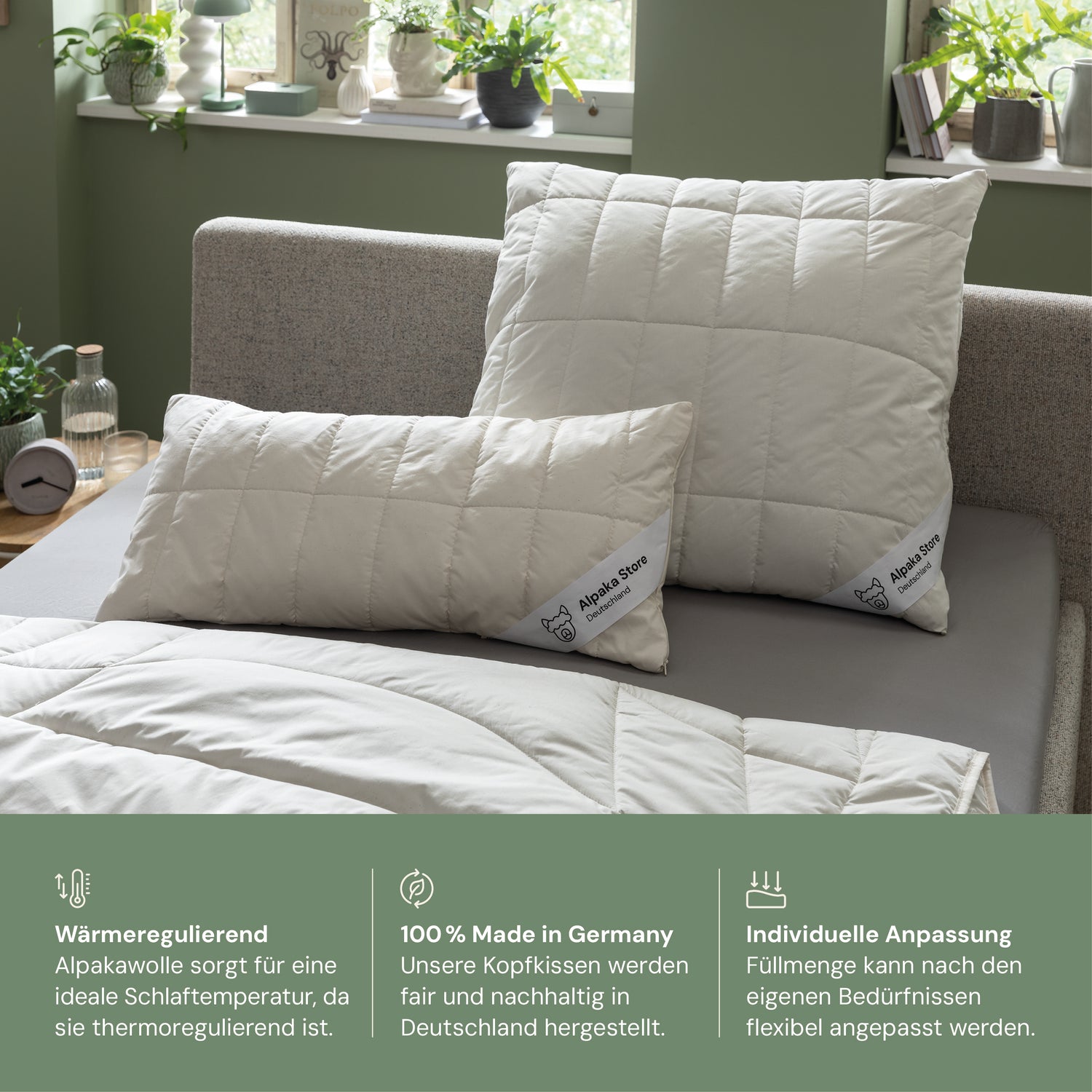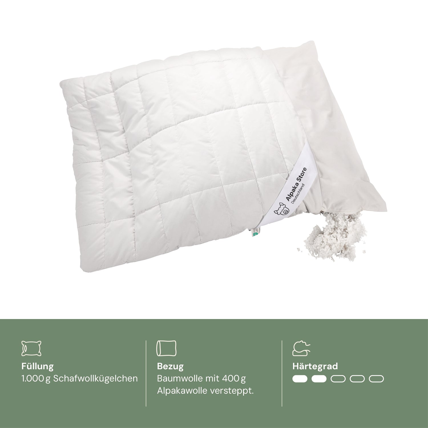For a calm and healthy sleep: A cuddly soft pillow quilted with alpaca wool that also provides extra support. Filled with sheep wool beads to stabilize the pillow.