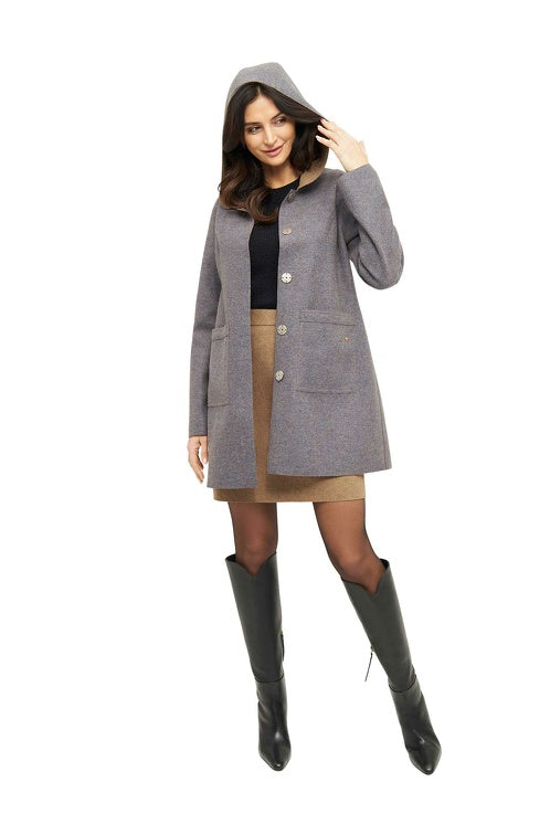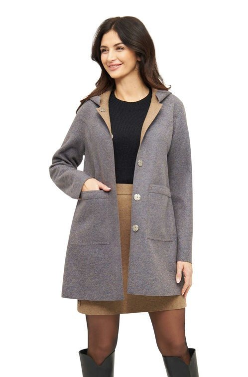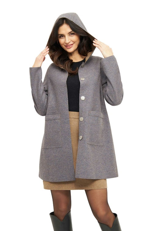 Das elegante Design mit Kapuze und großen Taschen lässt sich dank des Wendekonzepts vielseitig stylen – zwei Looks in einem Mantel für maximale Flexibilität.
